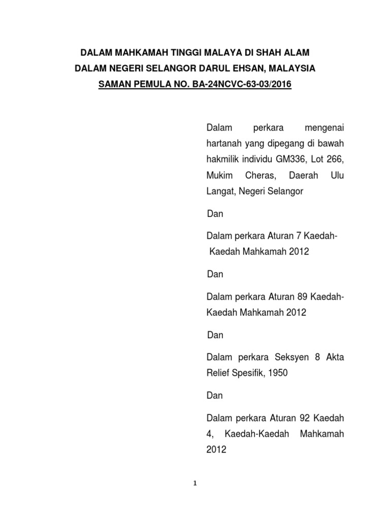 Dalam Mahkamah Tinggi Malaya Di Shah Alam Dalam Kaedah 1 Kaedah Kaedah Mahkamah 2012 Kkm 2012 Dan Pdf Document