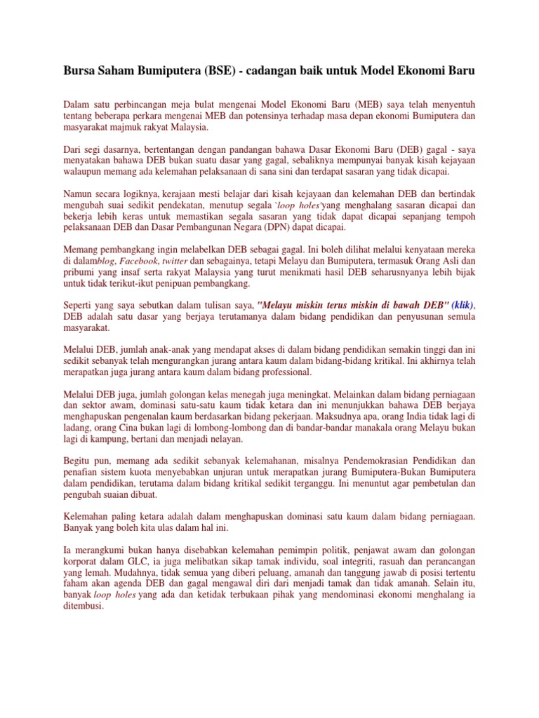 Bursa Saham Bumiputera Bse Cadangan Baik Untuk Model Ekonomi Baru