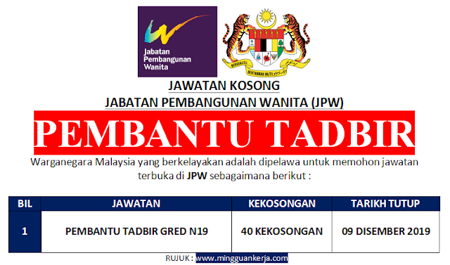 Jawatan Kosong Pembantu Tadbir Di Jabatan Pembangunan Wanita Ditawarkan Sehingga 09 Disember 2019 Mingguan Kerja